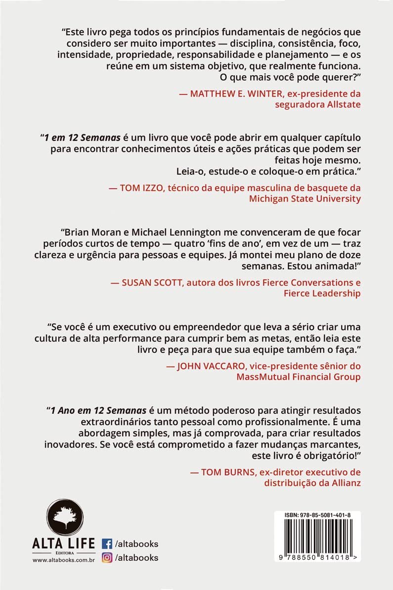 A maioria das organizações e pessoas trabalha com metas e planejamentos anuais em um ciclo de execução de doze meses. Porém, 1 Ano em 12 Semanas evita as armadilhas e a baixa produtividade do pensamento preso ao calendário anual. Este livro redefine o seu “ano” para ter doze semanas de duração. Durante esse período, não há tempo para se acomodar diante de uma urgência que só aumenta e se intensifica. 1 Ano em 12 Semanas traz foco e clareza no que é mais importante, e um senso de urgência para sua execução imediata. Ao final, grande parte do que é importante estará feito, gerando um impacto significativo nos resultados.