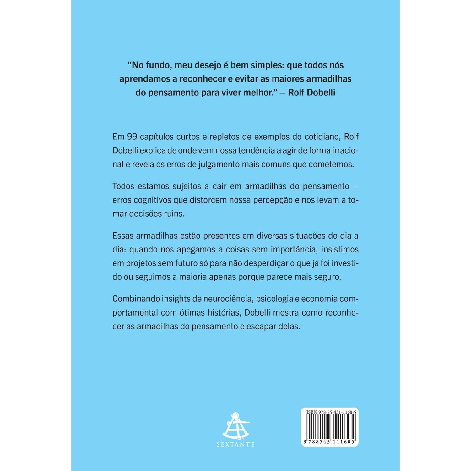 Combinando insights de neurociência, psicologia e economia comportamental com ótimas histórias, Dobelli mostra como reconhecer as armadilhas do pensamento, escapar delas e usar esse conhecimento para tomar decisões melhores.