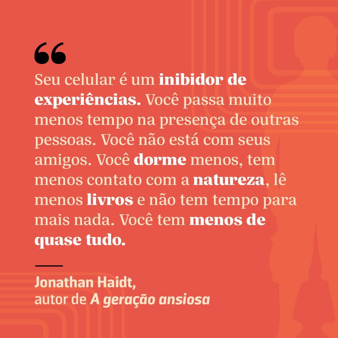 As crianças e os adolescentes estão em perigo. Desde o início dos anos 2010, as taxas de depressão, ansiedade e outros transtornos mentais têm crescido vertiginosamente nesses grupos. Em A geração ansiosa , o psicólogo social Jonathan Haidt explica as causas dessa epidemia e defende uma infância longe das telas.