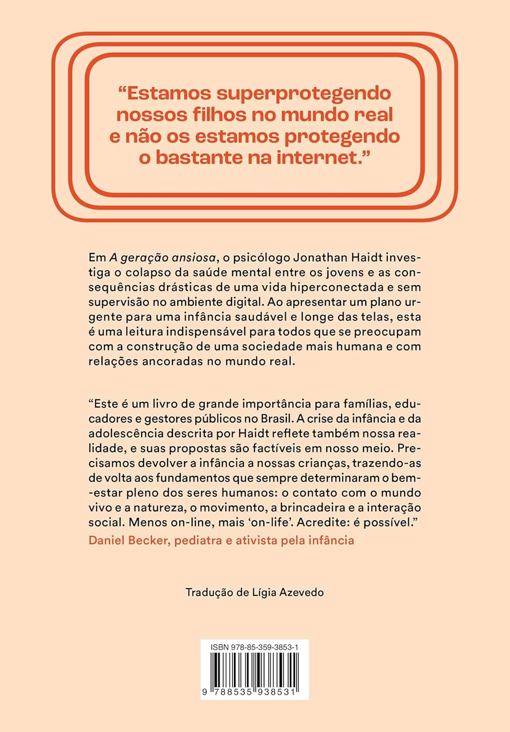 Diante desse cenário catastrófico, Haidt mostra o que pais, professores, escolas, empresas de tecnologia e governos podem fazer na prática para reverter a situação e evitar danos psicológicos ainda mais profundos. Um plano de ação que não podemos nos dar ao luxo de ignorar, porque o que está em jogo não é apenas o bem-estar de nossas crianças, mas da sociedade como um todo.