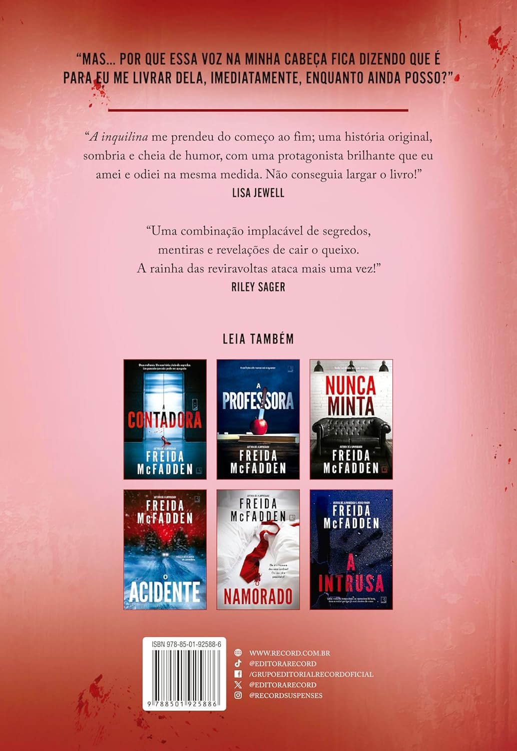 “ A inquilina me prendeu do começo ao fim; uma história original, sombria e cheia de humor, com uma protagonista brilhante que eu amei e odiei na mesma medida. Não conseguia largar o livro!” – Lisa Jewell