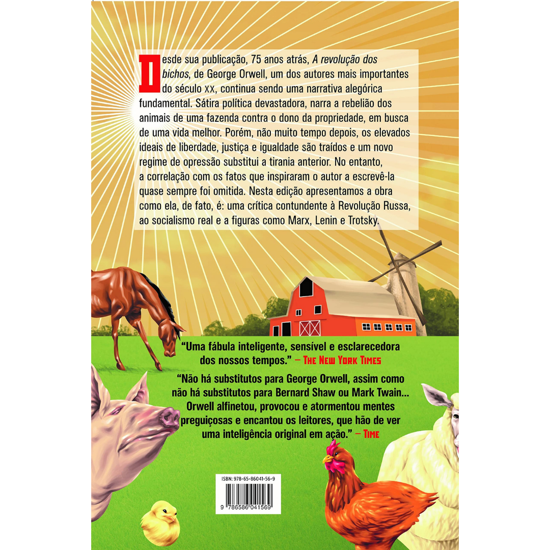 Publicado 75 anos atrás, A revolução dos bichos mantém em sua narrativa alegórica uma reflexão fundamental para os nossos tempos. No entanto, a correlação com os fatos que inspiraram o autor a escrevê-la quase sempre foi omitida. Aqui apresentamos a obra como ela, de fato, é: uma crítica contundente a Revolução Russa, ao socialismo real que foi posto em prática e a figuras como Marx, Lenin e Trotsky. Sátira política devastadora e fábula moral espirituosa, na tradição de Esopo, La Fontaine, Swift e Voltaire, narra a rebelião dos animais de uma granja contra o dono da propriedade, em busca de uma vida melhor. Porém, não muito tempo depois, os elevados ideais de liberdade, justiça e igualdade são traídos e um novo regime de opressão substitui a tirania anterior. “Todos os animais são iguais, mas alguns animais são mais iguais que os outros” passa a ser o único mandamento em vigor e condensa em poucas palavras como o poder corrompe até mesmo as causas mais nobres. Em A revolução dos bichos, Orwell, espírito independente e radical nato, desencantado com os descaminhos da Revolução Russa de 1917, satiriza, por meio de uma fábula, o totalitarismo do regime stalinista, feito de mentiras, traições e terror.