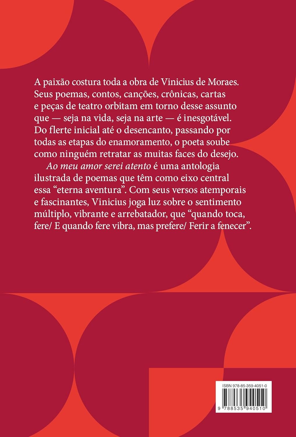 Ao meu amor serei atento é uma antologia ilustrada de poemas que descrevem esta “eterna aventura”. Com seus versos atemporais, Vinicius de Moraes joga luz sobre esse sentimento múltiplo, vibrante e arrebatador e, com lirismo absoluto, nos ensina a viver “cada instante/ Desassombrado, doido, delirante/ Numa paixão de tudo e de si mesmo”.