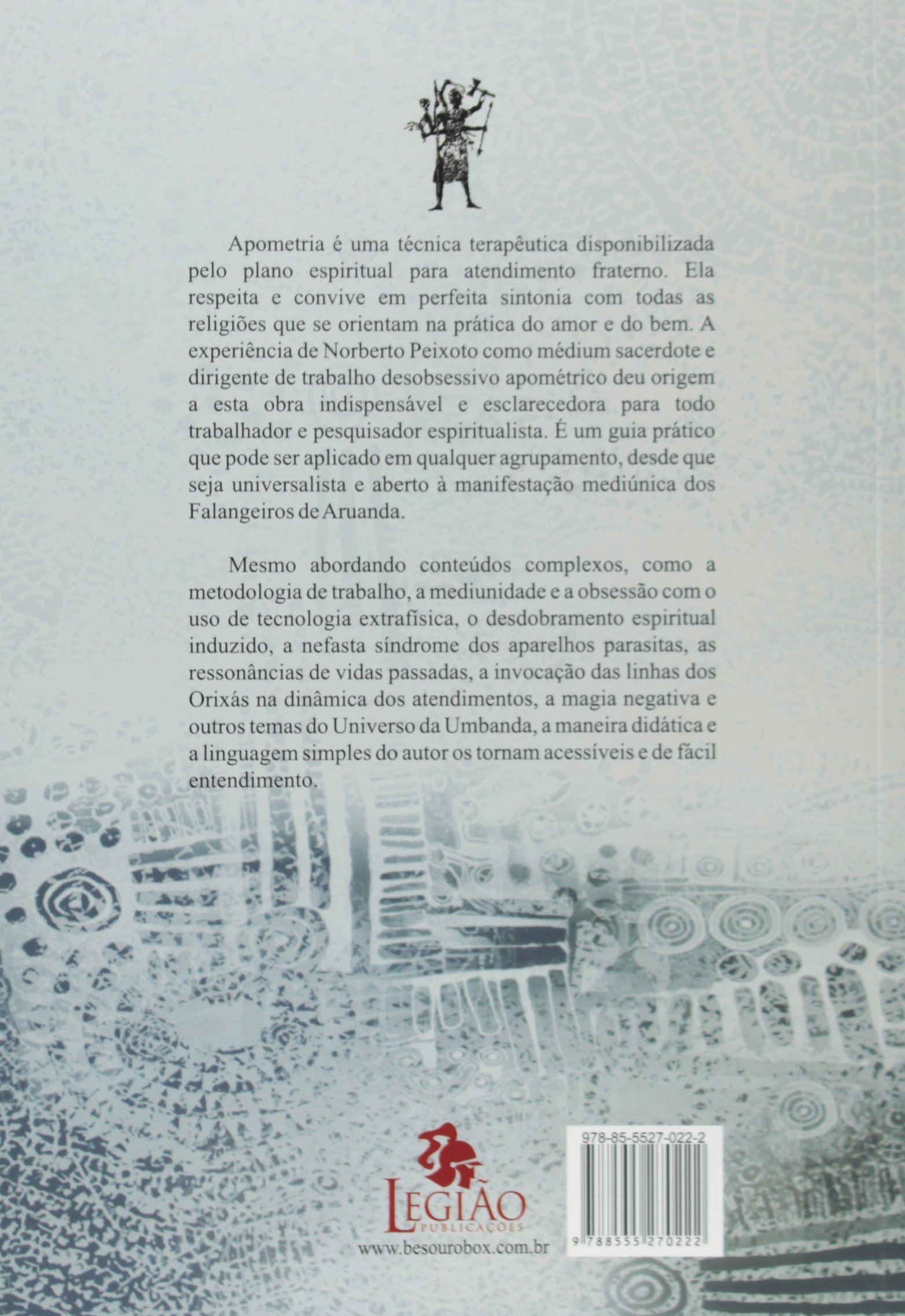 A Apometria é uma técnica terapêutica disponibilizada pelo Plano Espiritual para atendimento fraterno, respeita e convive em perfeita sintonia com todas as religiões que se orientam na prática do bem e do amor fraterno. A experiência do autor Norberto Peixoto como médium sacerdote e dirigente de trabalho desobsessivo apométrico deu origem a essa obra indispensável para todo trabalhador e pesquisador espiritualista. Além de esclarecedora, essa obra é um guia de trabalho prático que pode ser aplicado em qualquer agrupamento, desde que seja universalista e aberto à manifestação mediúnica dos Falangeiros de Aruanda. Mesmo abordando conteúdos complexos como a metodologia de trabalho, o desdobramento espiritual induzido, a mediunidade e a obsessão com o uso de tecnologia extrafísica, a nefasta síndrome dos aparelhos parasitas, as ressonâncias de vidas passadas, a magia negativa, a invocação das linhas dos Orixás na dinâmica dos atendimentos e outros instigantes temas do Universo da Umbanda, a maneira didática e a linguagem simples do autor os tornam acessíveis e de fácil entendimento. orelha de 9cm