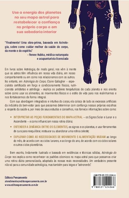E se os astros pudessem guiar sua saúde e bem-estar? Astrologia do Corpo revela como seu mapa astral influencia sua rotina, metabolismo e necessidades físicas. A nutricionista, treinadora e astróloga Claire Gallagher ensina a interpretar os signos solar, lunar e ascendente para criar uma abordagem personalizada de alimentação, movimento e autocuidado.