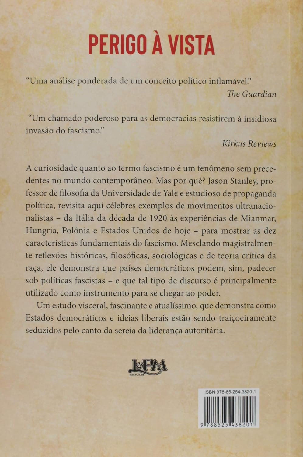 Fascismo: originalmente, regime de cunho ideológico estabelecido pelo ditador Benito Mussolini na Itália da década de 1920, que valoriza ideais de nação e raça em detrimento dos valores individuais e é representado por um líder autoritário. Mas por que esse termo voltou à ordem do dia em pleno século XXI? À luz de episódios recentes de democracias que enveredaram para regimes mais ou menos totalitários; de líderes democraticamente eleitos que usam retóricas fascistas para fazer política, como Donald Trump; mas também bebendo no extenso histórico do fascismo – de Mein Kampf, de Hitler, aos discursos fratricidas que levaram ao genocídio de Ruanda na década de 1990 –, Jason Stanley analisa a estrutura comum por trás de todas essas experiências. Ele estabelece os dez principais fundamentos do fascismo, entre os quais encontramos: a ideia de reviver um passado mítico e glorioso; o uso de propaganda para distorcer e minar conceitos e instituições democráticas (tendo como pretexto o combate à corrupção); ataques a universidades e intelectuais; uma forte noção de hierarquia; a política da lei e da ordem baseada na ideia de grupos minoritários criminosos; e a valorização do “trabalho duro” em prejuízo de sistemas de bem-estar social. Tais mecanismos apoiam-se uns aos outros simbioticamente, criando e reforçando divisões, ao mesmo tempo em que minam os pilares da democracia – eleições livres, judiciário independente, liberdade de expressão e de imprensa etc. – que poderiam conter a ascensão totalitária. A história nos mostra o imenso perigo de subestimar o poder cumulativo dessas táticas, que deixam a sociedade cada vez mais vulnerável aos apelos da liderança autoritária. Apenas identificando as políticas fascistas, o autor argumenta, poderemos resistir a seus efeitos mais danosos e retornar aos ideais democráticos.