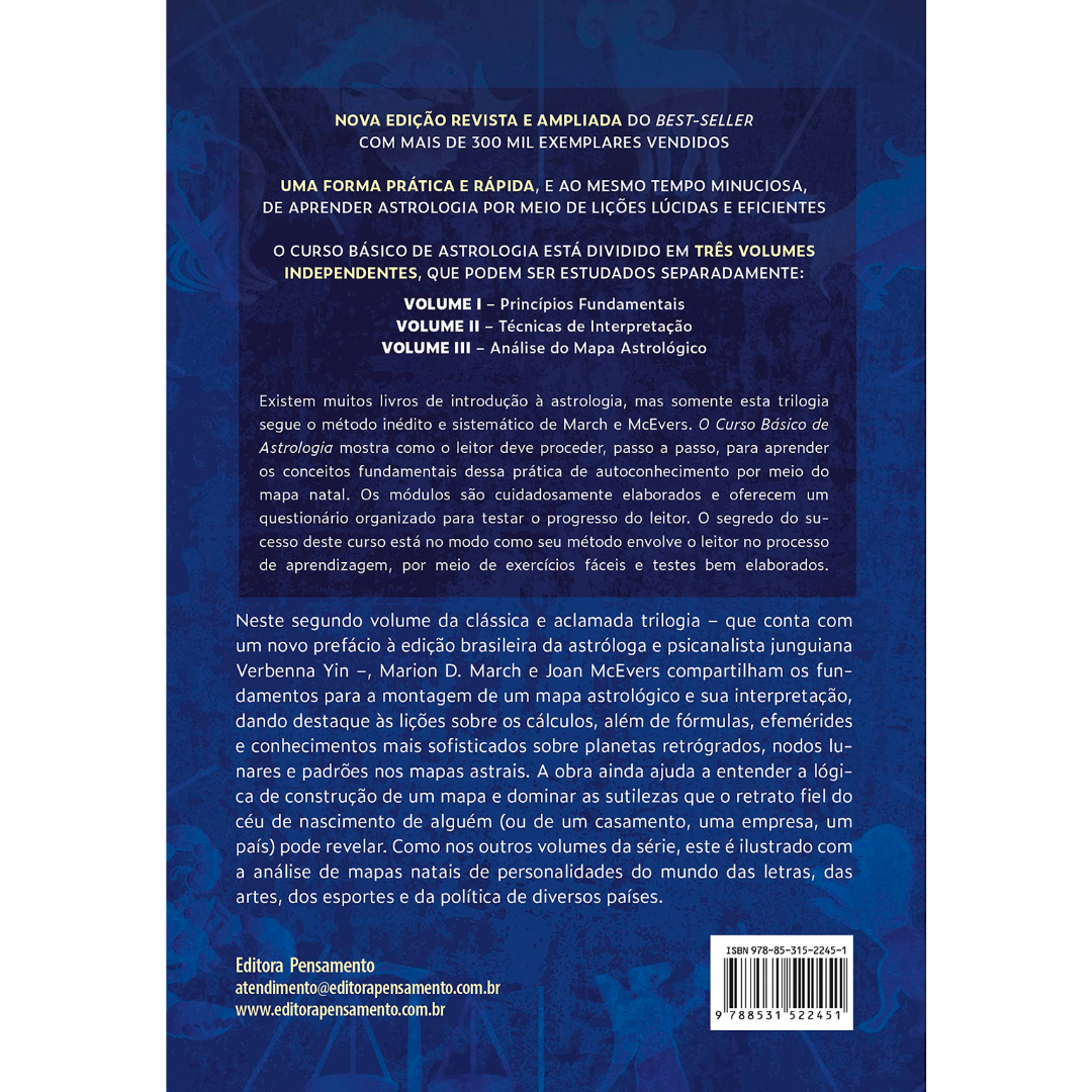O Curso Básico de Astrologia apresenta uma forma prática, rápida e detalhista de aprender astrologia com lições claras e eficientes. Neste segundo volume, as autoras compartilham os fundamentos para a montagem de um mapa astrológico e sua interpretação, dando destaque às lições sobre os cálculos, além de fórmulas, efemérides e conhecimentos mais sofisticados sobre planetas retrógrados, nodos lunares e padrões nos mapas astrais. A obra ainda ajuda a entender a lógica de construção de um mapa e traz exemplos de mapas natais de personalidades do mundo das letras, das artes, dos esportes e da política de diversos países, que ajudam no aprofundamento do estudo sobre o tema.