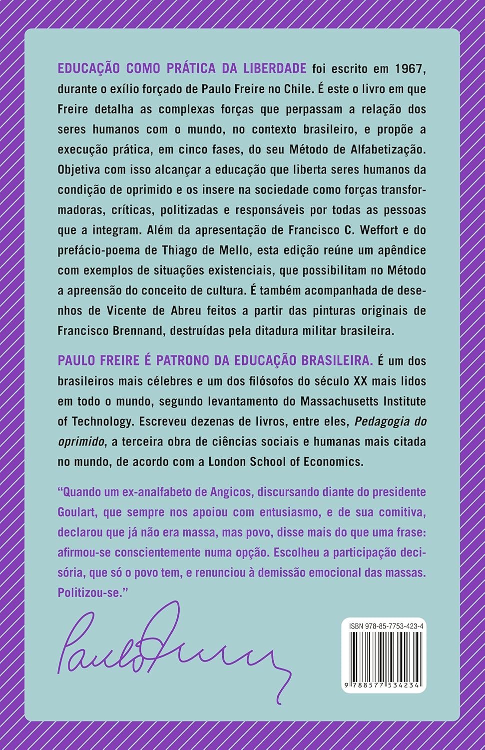 Além de apresentação de Francisco C. Weffort e prefácio-poema de Thiago de Mello, esta edição reúne apêndice com exemplos de situações existenciais, que possibilitam no Método a apreensão do conceito de cultura. São acompanhadas de desenhos de Vicente de Abreu feitos a partir das pinturas originais de Francisco Brennand, destruídas pela ditadura militar brasileira.