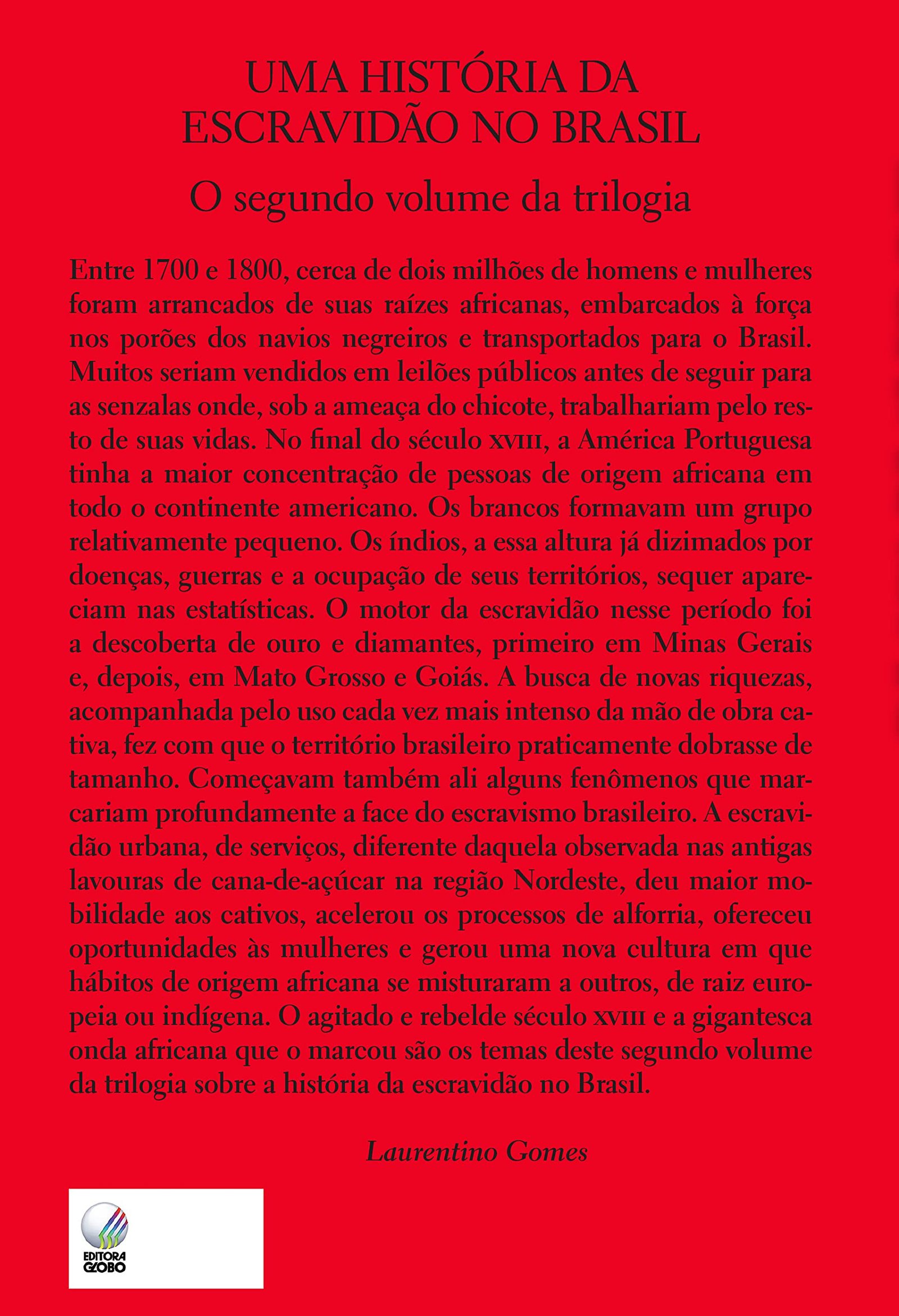 Nenhum outro assunto é tão importante e tão definidor da nossa identidade nacional quanto a escravidão. Conhecê-lo ajuda a explicar o que fomos no passado, o que somos hoje e também o que seremos daqui para a frente. Em um texto impactante que inclui imagens e gráficos, Laurentino Gomes lança o segundo volume de sua obra, resultado de 6 anos de pesquisas, que incluíram viagens por 12 países e 3 continentes.