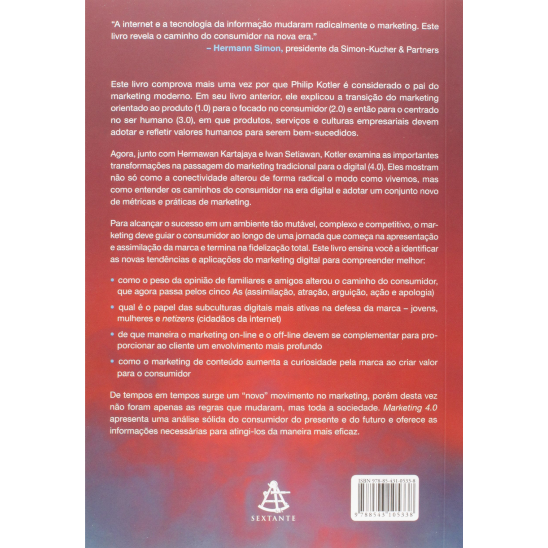 Este livro comprova mais uma vez porque Philip Kotler é considerado o pai do marketing moderno. Em seu livro anterior, ele explicou a transição do marketing orientado ao produto (1.0) para o focado no consumidor (2.0) e então para o centrado no ser humano (3.0), em que produtos, serviços e culturas empresariais devem adotar e refletir valores humanos para serem bem-sucedidos.