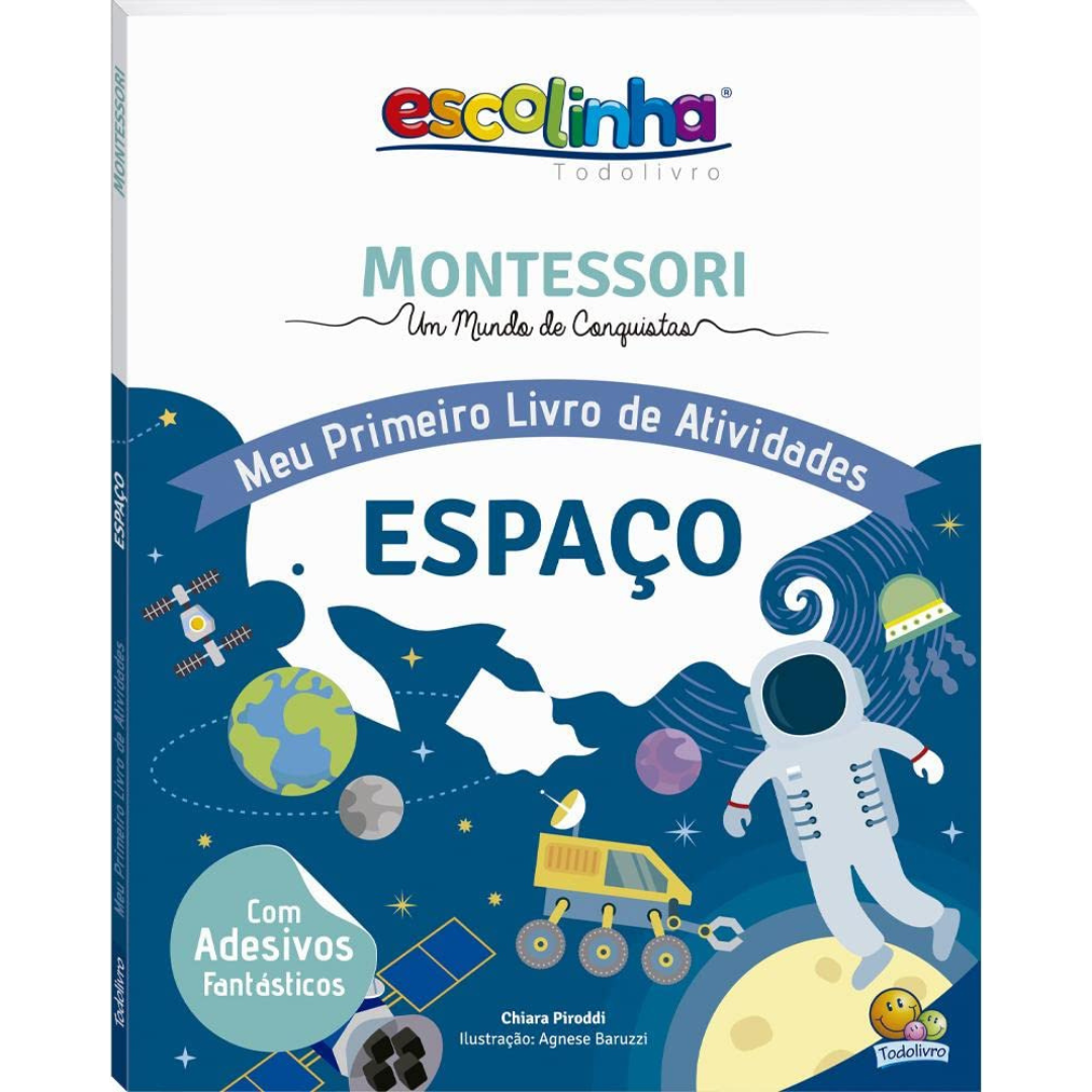 Seguindo os príncípios do Método Montessori, este livro oferece atividades envolventes e criativas, que foram especialmente elaboradas para estimular as habilidades cognitivas das crianças, em uma aventura brilhante pelo espaço. Além de aprender fatos curiosos sobre o Sistema Solar, como a vida na estação espacial, asteroides e outros corpos celestiais, divertindo-se com labirintos, formatos para reconhecer e pintar, figuras para recortar e vários adesivos para colar, o pequeno explorador vai começar a compreender melhor quão rico é o nosso universo.