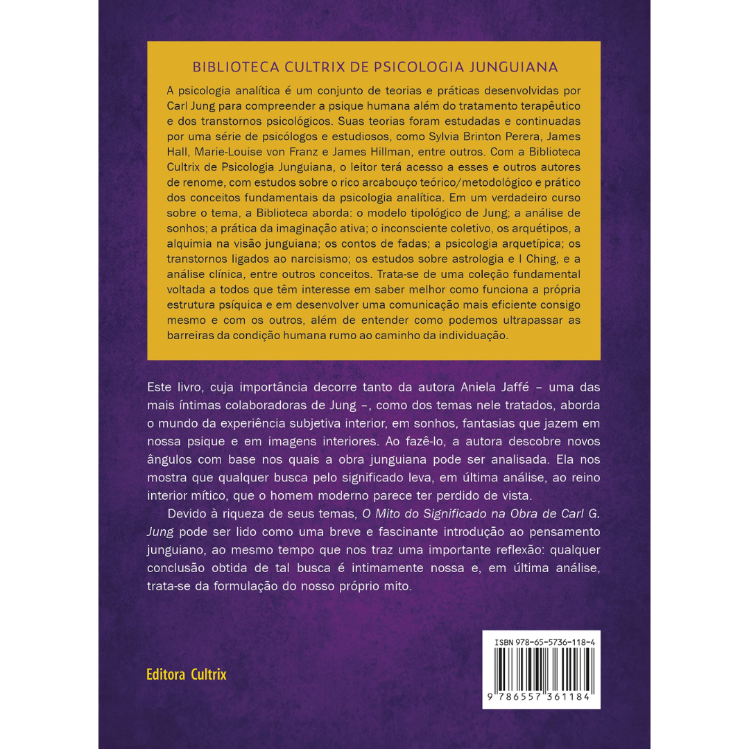 Este livro, quarto volume da coleção Biblioteca Cultrix de Psicologia Junguiana, trata de temas relevantes da obra de Jung como o mundo da experiência subjetiva interior, em sonhos, fantasias que jazem em nossa psique e em imagens interiores. Ao fazê-lo, a autora descobre novos ângulos com base nos quais a obra junguiana pode ser analisada. Ela nos mostra que qualquer busca pelo significado leva, em última análise, ao reino interior mítico, que o homem moderno parece ter perdido de vista. Devido à riqueza de seus temas, O Mito do Significado na Obra de Carl G.Jung pode ser lido como uma breve e fascinante introdução ao pensamento junguiano, ao mesmo tempo que nos traz uma importante reflexão: qualquer conclusão obtida de tal busca é intimamente nossa e, em última análise, trata-se da formulação do nosso próprio mito.