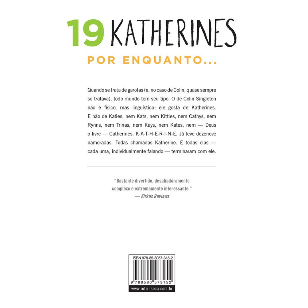 Se o assunto é relacionamento, o tipo de garota de Colin Singleton tem nome: Katherine. E, em se tratando de Colin e Katherines, o desfecho é sempre o mesmo: ele leva o fora. Já aconteceu muito. Dezenove vezes, para ser exato.