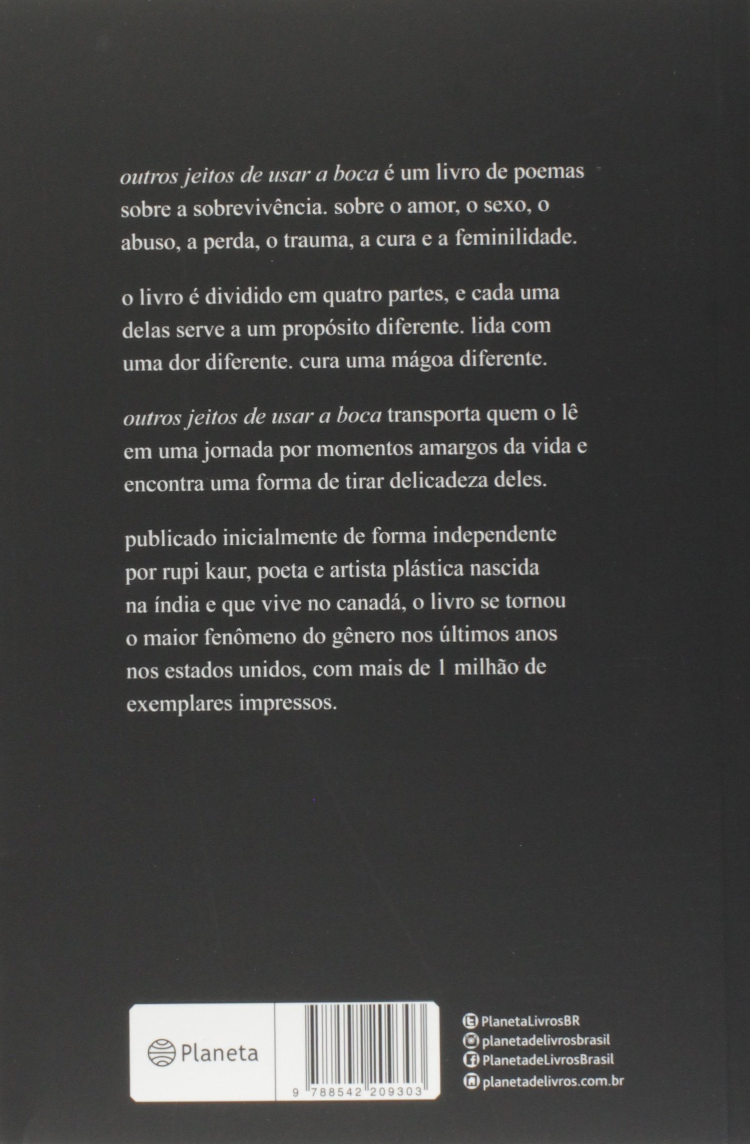 Outros jeitos de usar a boca é um livro de poemas sobre a sobrevivência. Sobre a experiência de violência, o abuso, o amor, a perda e a feminilidade. O volume é dividido em quatro partes, e cada uma delas serve a um propósito diferente. Lida com um tipo diferente de dor. Cura uma mágoa diferente. Outros jeitos de usar a boca transporta o leitor por uma jornada pelos momentos mais amargos da vida e encontra uma maneira de tirar delicadeza deles. Publicado inicialmente de forma independente por Rupi Kaur, poeta, artista plástica e performer canadense nascida na Índia e que também assina as ilustrações presentes neste volume , o livro se tornou o maior fenômeno do gênero nos últimos anos nos Estados Unidos, com mais de 1 milhão de exemplares vendidos.