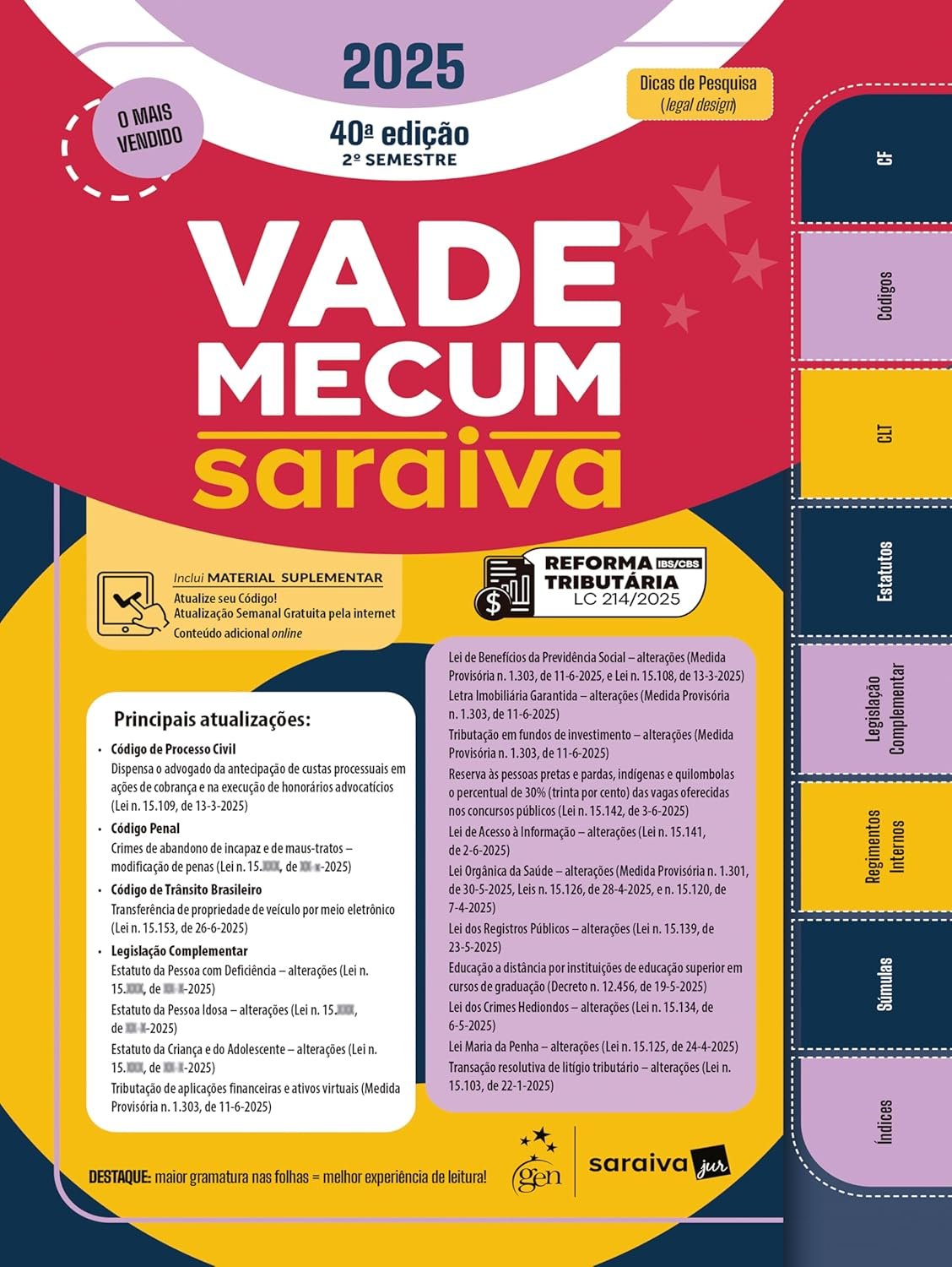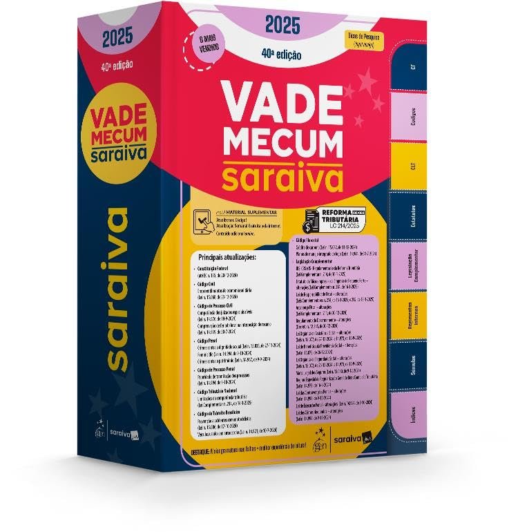 O Vade Mecum Saraiva Tradicional chegou à 40ª edição mais completo, atualizado e pronto para impulsionar sua trajetória em 2025! Líder de vendas no mercado jurídico brasileiro, o Vade Mecum Saraiva é a escolha número um de estudantes, concurseiros, advogados e profissionais do Direito há mais de 15 anos. Combinando tradição e inovação, esta edição traz legislação atualizada e funcionalidades que facilitam o uso em qualquer momento, seja nos estudos ou na prática jurídica. Por que escolher o Vade Mecum Saraiva – 40ª edição 2025? – Mantenha-se atualizado: Acompanhe as mudanças mais recentes no ordenamento jurídico – tudo selecionado com base na grade curricular das principais faculdades de Direito e em editais de concursos para carreiras jurídicas; – Encontre o que precisa com facilidade: Divisões coloridas e tarjas destacadas para você localizar qualquer norma com agilidade, além de fontes maiores nas seções mais importantes, como a Constituição, Códigos e CLT; – Pesquise de forma eficiente: Índices completos para buscar por assunto, ordem alfabética ou cronológica. Tudo à mão para você economizar tempo e focar no que realmente importa; – Dicas de pesquisa (legal design) – tutorial nas páginas iniciais sobre como utilizar seu Vade Mecum Saraiva de maneira completa. – Tenha o melhor material: Formato 18×27 cm, maior gramatura nas folhas para máxima durabilidade e clareza visual; – Amplie seu aprendizado: Plataforma online e gratuita com conteúdos complementares, incluindo legislação adicional e atualização semanal de todo o conteúdo impresso, através do “Atualize seu Código”. Com a tradição, organização e qualidade da Saraiva Jur, o Vade Mecum Saraiva é seu aliado para os estudos, passar na OAB, alcançar a carreira pública dos seus sonhos e se destacar no mercado jurídico. ?