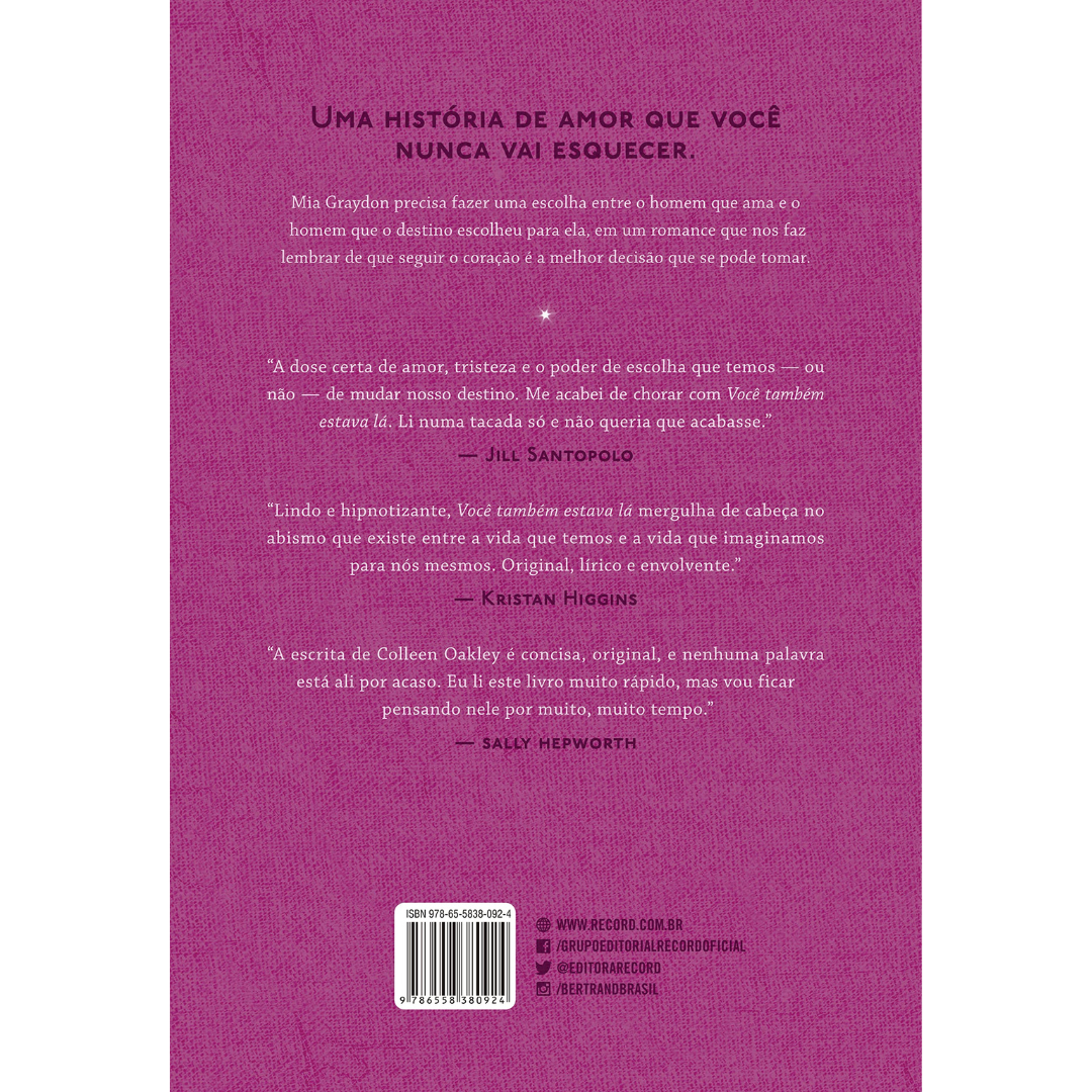 Neste romance inesquecível de Colleen Oakley, autora best-seller do USA Today, Mia Graydon precisa fazer uma escolha entre o homem que ama e o homem que o destino parece ter escolhido para ela. Você também estava lá reforça que seguir o coração é a melhor decisão que se pode tomar.